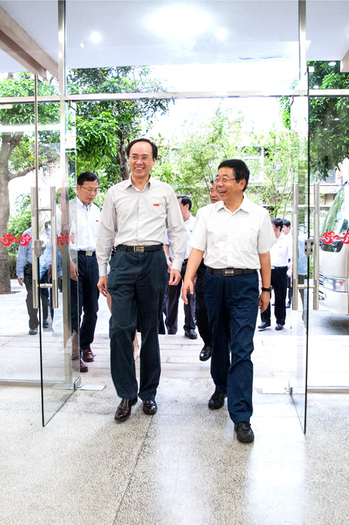 陈宝生部长在刘海峰院长的陪同下步入教育研究院