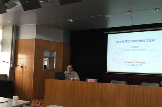 5月27日,刘海峰教授应中国教育科学研究院邀请,在该院作题为《高考改革新方案的出台与进展》的学术报告,报告会由中国教育科学研究院院长助理、《教育研究》杂志主编高宝立教授主持。刘海峰教授首先从高考现象、高考问题及高考本质入手,分析了当前为何要进行高考改革,揭示了高考改革的深层内因;其次,刘海峰教授梳理了历年高考重要课题的立项,以及国家层面高考改革的重大政策与意见,清晰地呈现了新高考改革方案出台的基本过程;再次,刘海峰教授结合2014年9月出台的《国务院关于深化考试招生制度改革的实施意见》,重点剖析了高考名额分配、高考内容与形式改革、加分政策调整以及英语科目一年两考等主要改革举措,以及高考改革过程中需要考虑的主要矛盾和现实困境;最后,刘海峰教授根据“分类考试、综合评价、多元录取”等高考改革总体目标,深入探讨了新高考背景下高中教育与大学招生的应对之策。在互动环节,刘海峰教授圆满回应了关于“如何保障弱势群体高考利益”、“高考文理不分对高考科目选考的影响”等现场提问。